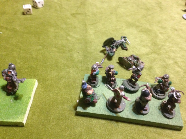 Well, some dwarves died, so that under the half of its original strenght, one company was broken... It was however time for Gimli son of Gloin and his surviving warriors to counterstrike in a dwarven style.. First an heroic duel to finish the orc leader off..